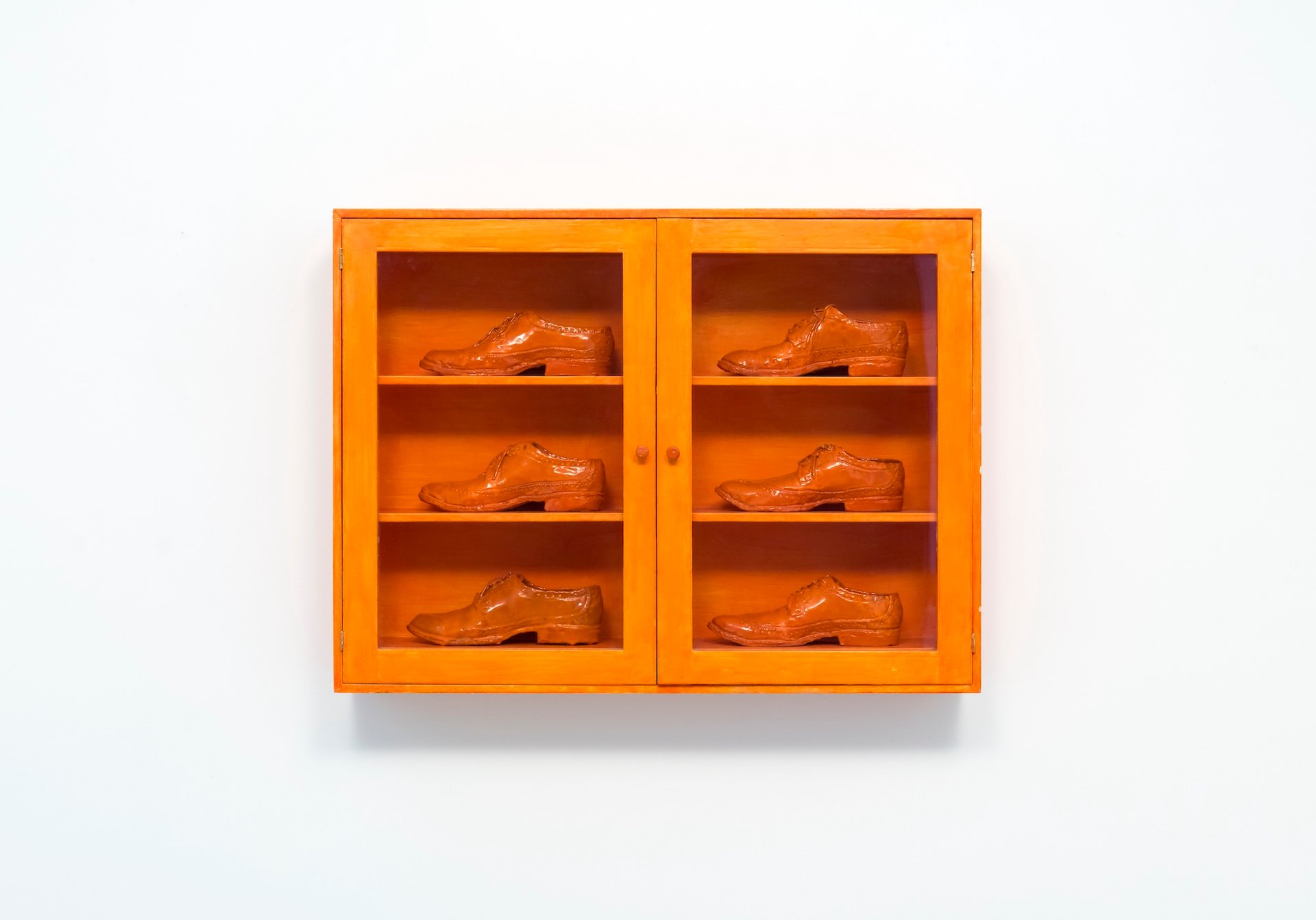 Gathie Falk, Single Proper Males’s Sneakers: Bootcase with 6 Orange Brogues, 1973 © Property of Gathie Falk. Picture: Equinox Gallery