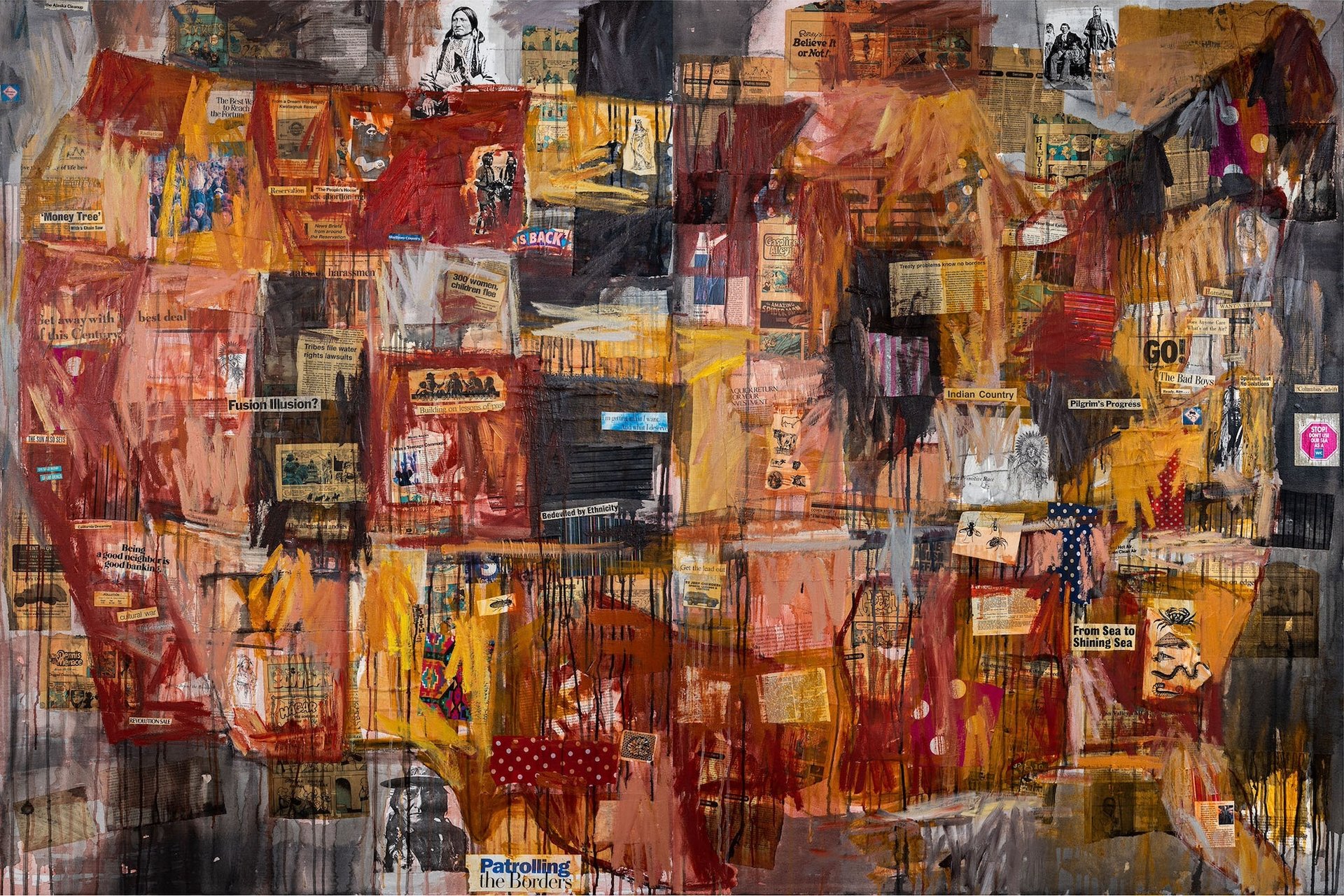 “In 1992 I created a sequence of works titled I See Crimson to remind viewers that Native Individuals are nonetheless alive,” she instructed Sims. “That is at all times my curiosity, although I’m collaging issues like outdated pictures and Nineteen Thirties fruit labels on the surfaces of those work. However then there are additionally newspaper articles about present occasions. So there’s a historic continuity from one thing up to now, as much as the current.”